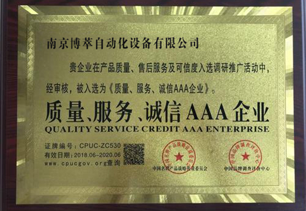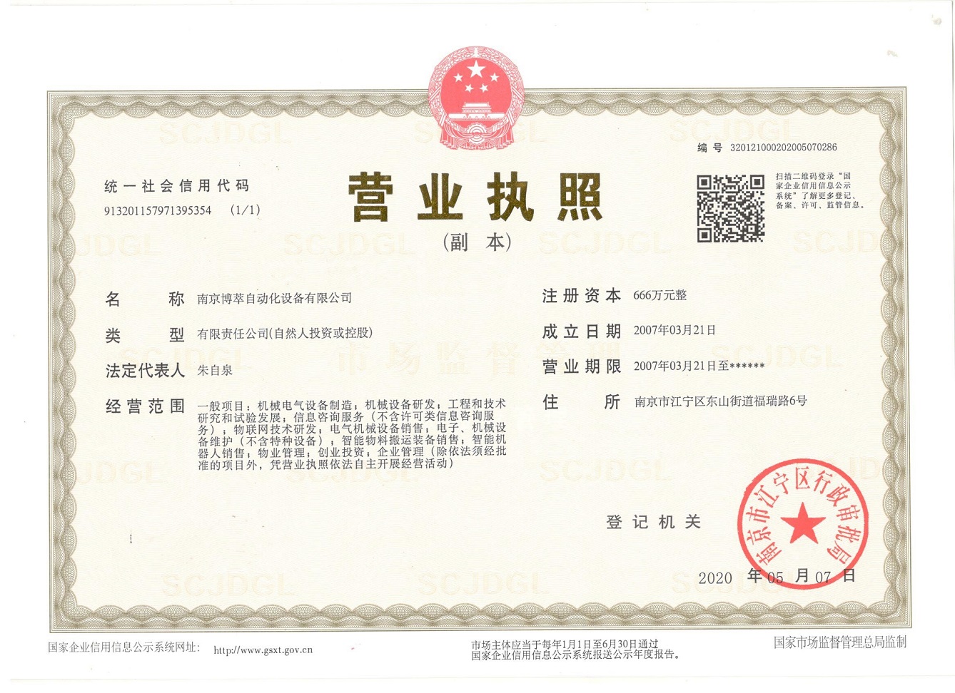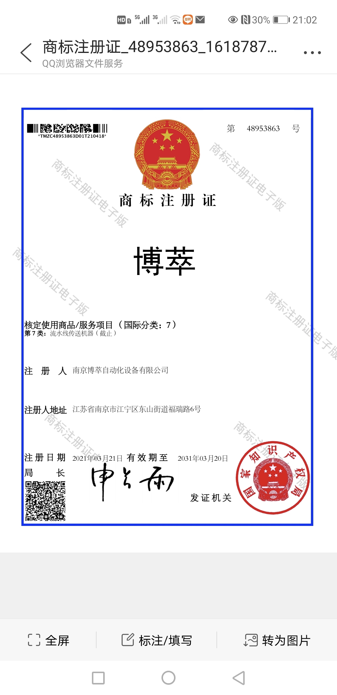 祝贺公司获得博萃品牌注册商标证书,核定使用商品/服务项目(国际分类:7,第7类:流水线传送机器(截止)