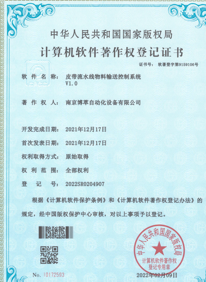 祝贺公司产品皮带流水线物料输送控制系统获得软著证书