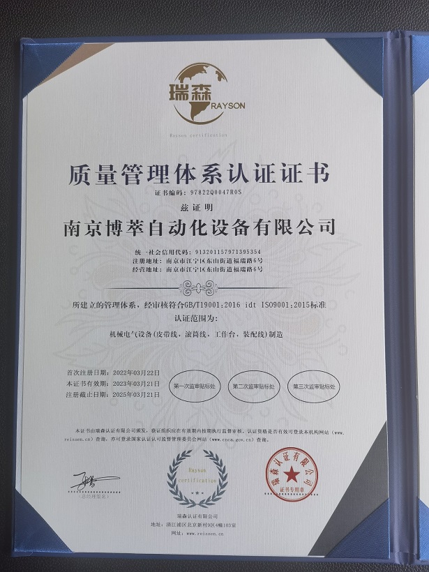 祝贺本公司获得ISO9001国际质量体系认证,并符合GB/T9001:2016 idt 标准认证范围为:机械电气设备(包括各类皮带线,滚筒线,工作台,装配线)制造
